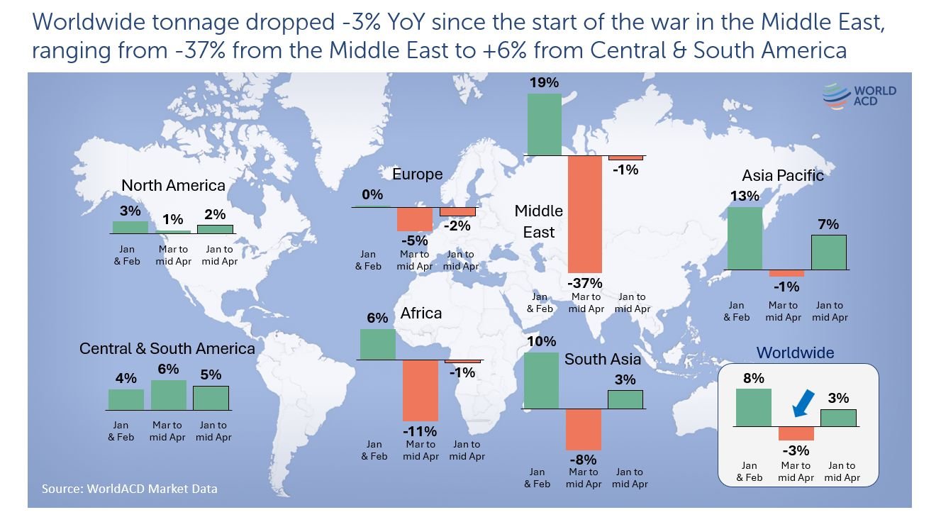 According to data from WorldACD Market Data, worldwide cargo volumes grew by 8% year-on-year during January and February. However, this positive trend reversed sharply from March onwards, with a 3% decline recorded through mid-April. As a result, overall growth for the January to mid-April period stands at a modest 3%.