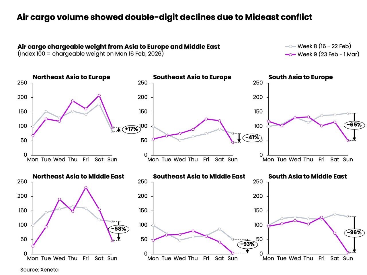 Research published by Rotate on 3 March suggested that Sri Lanka, Pakistan and Norway are among the countries most exposed to the reduction in Middle East cargo flights. Meanwhile, Xeneta expects air freight rates on affected trade lanes to climb sharply and has advised shippers to delay signing long-term contracts until conditions stabilise.